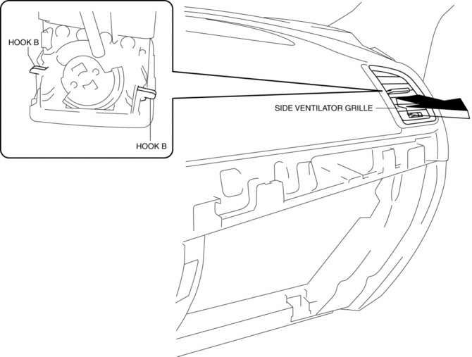 4. Insert your hand from the area where the glove compartment was installed, remove the side ventilator grille in the direction of the arrow shown in the figure while detaching hooks B.