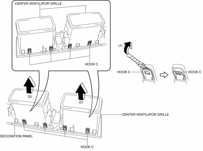 3. Push the edge of center ventilator grille in the direction of arrow (1) and detach hooks C.