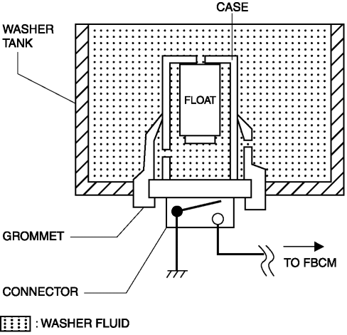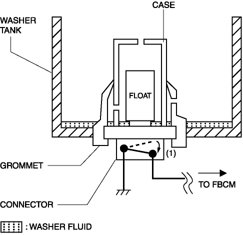 1. Washer fluid enters the case of the washer fluid-level sensor, the float rises, and the connector switch turns off.