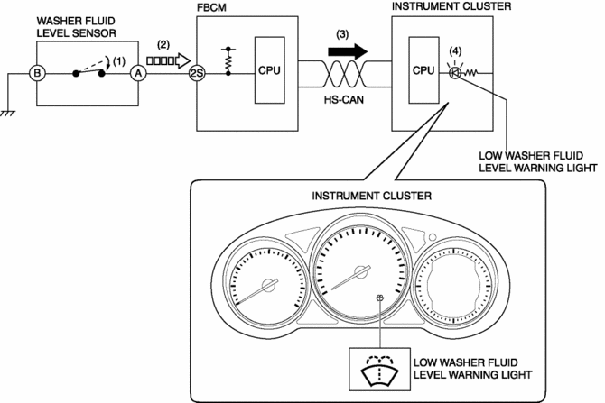 4. When the instrument cluster receives the low washer fluid level warning light illumination request signal, it illuminates the low washer fluid level warning light. (4)