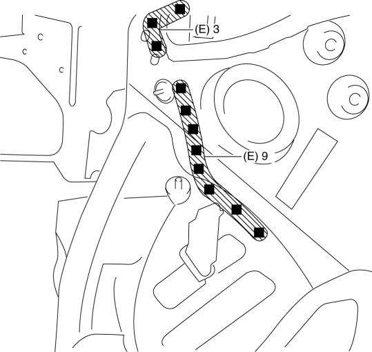 8. Plug weld the 12 locations indicated by (E) from the inside shown in the figure, then install the wheel apron component.