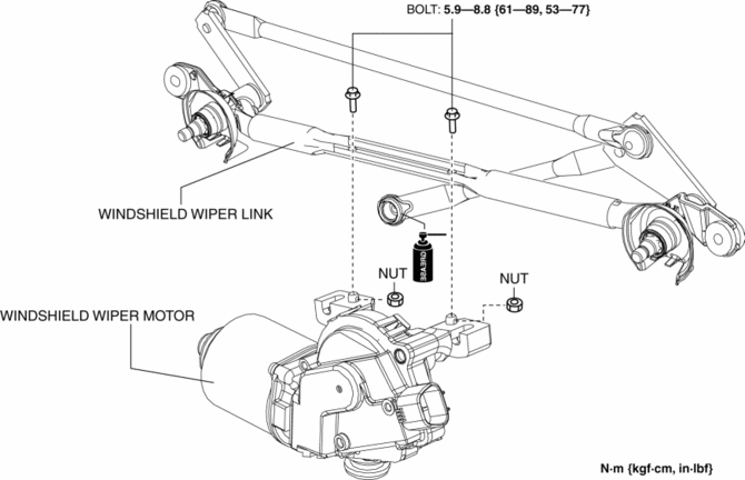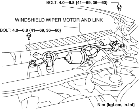 10. Remove bolts securing the windshield wiper motor and windshield wiper link, and remove nuts from windshield wiper motor.