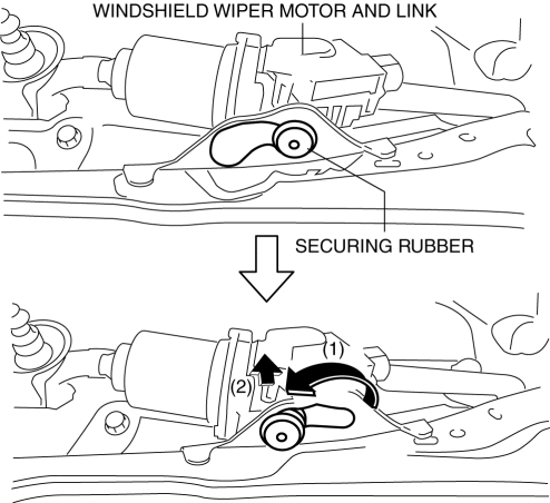 6. Move the windshield wiper motor and link in the order of the arrows (1) and (2) to remove the securing rubber from the vehicle.