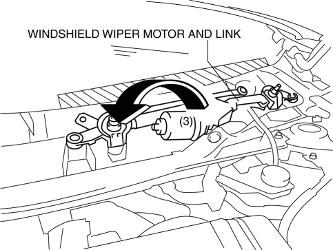 7. Remove the windshield wiper motor and link from the vehicle in the direction of the arrow (3) while being careful not to allow the windshield wiper end to interfere with the windshield wiper motor and link.